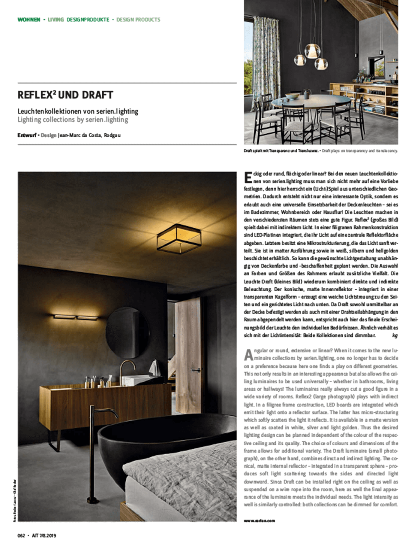 Angular, round, flat or linear – what do you prefer? The new luminaire collections from serien.lighting are so diverse that you no longer have to commit to a preference. Here there is a (light) interplay of different geometries. As a result, not only does everything look great, but you can also use the ceiling lights in completely different rooms – in the bathroom, living area or hallway. The lights simply fit into any room. The “Reflex2” luminaire from Serien Lighting plays with indirect light (large image). The LED boards are integrated into a filigree frame construction and emit their light onto a central reflector surface. The latter has a microstructure that ensures that the light is distributed evenly. You can buy them in a matt finish as well as coated in white, silver and light gold. This allows you to plan the desired lighting design regardless of the color and texture of the ceiling. The choice of colors and sizes of the frame provides additional variety. The Serien Lighting “Draft” luminaire (small picture) combines direct and indirect lighting. The conical, matt internal reflector – which is integrated into a transparent spherical shape – provides soft light diffusion to the sides and directed light downwards. Draft can either be fixed directly to the ceiling or suspended in the room using a wire suspension. This allows you to hang the luminaire according to your own requirements and the result always looks good. You can also easily adjust the light intensity by dimming the luminaire.